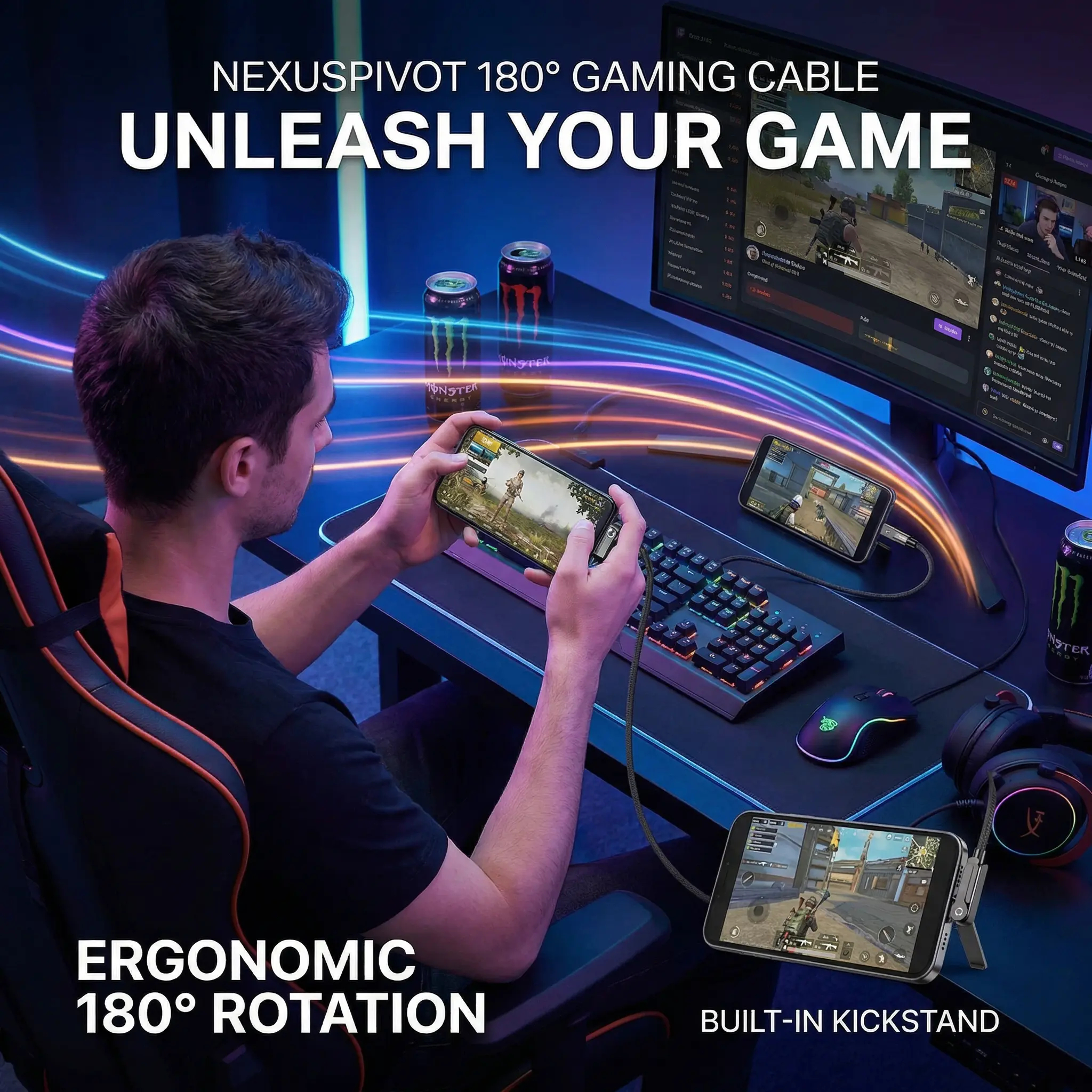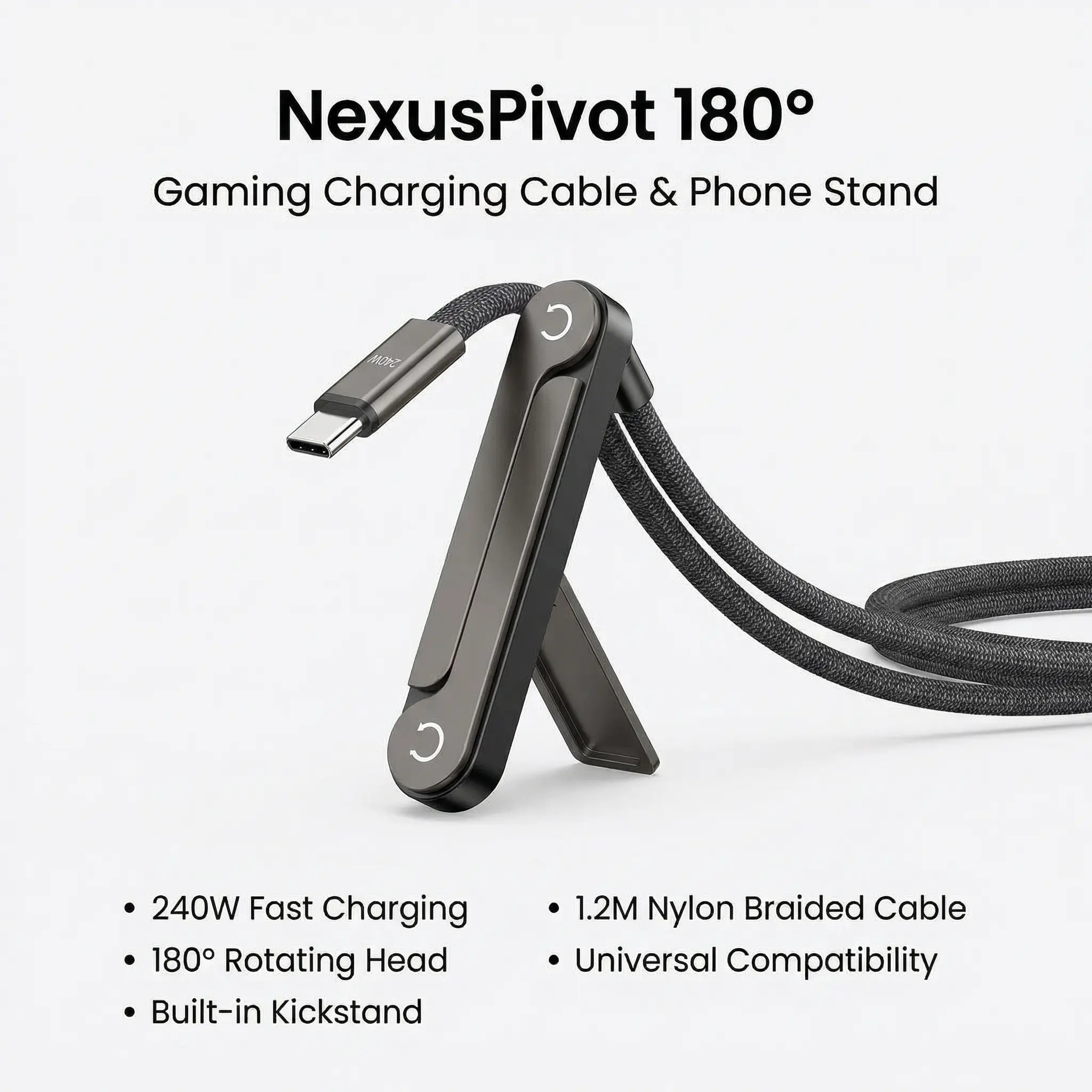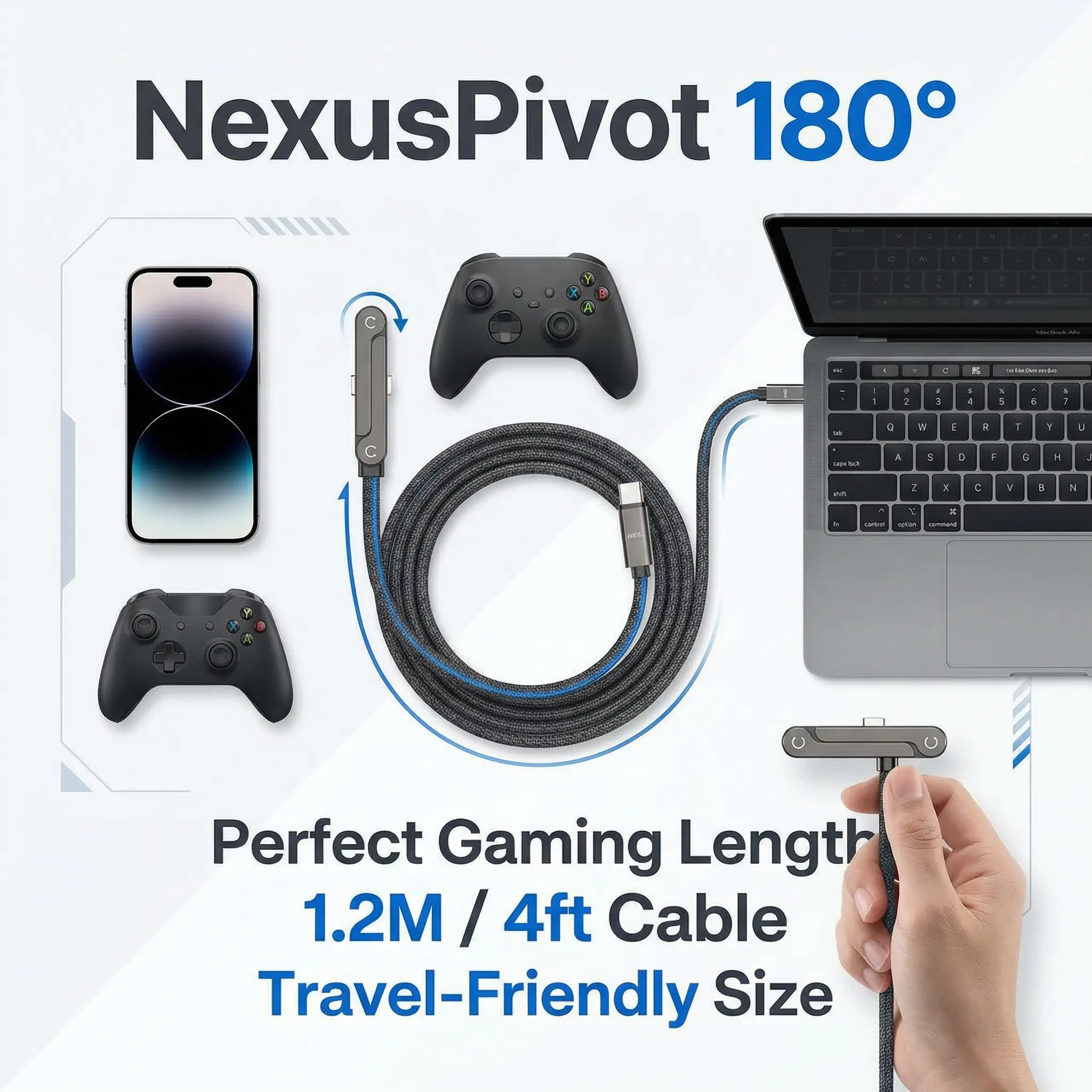 Game comfortably while charging with the NexusPivot 180° Gaming Cable! The unique rotating head moves with your grip, so no more blocked hands during battles. Plus, a hidden kickstand lets you watch videos hands-free.
