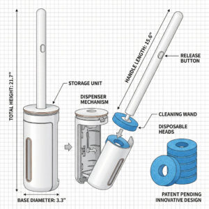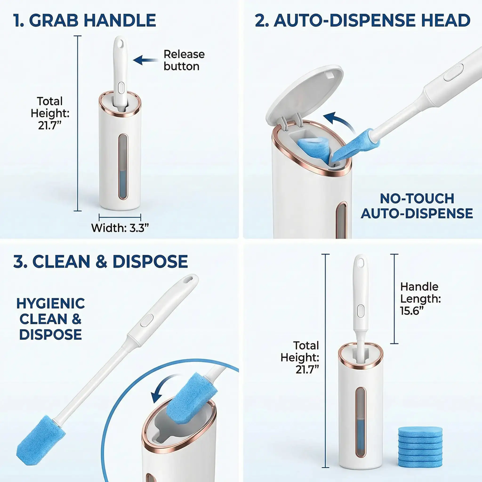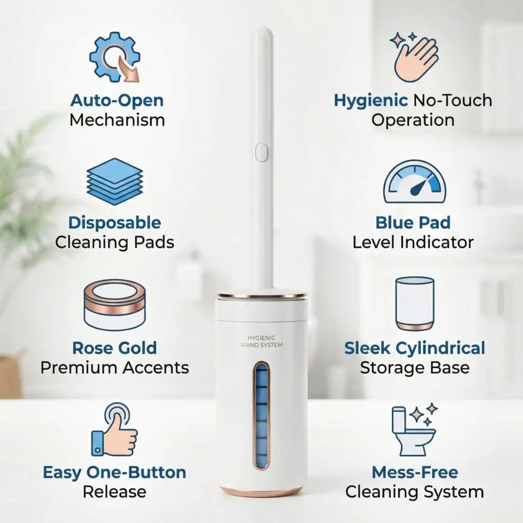 Includes: Wand, Auto-Open Base, Mount, & 8 Refill Heads. Upgrade your bathroom today!