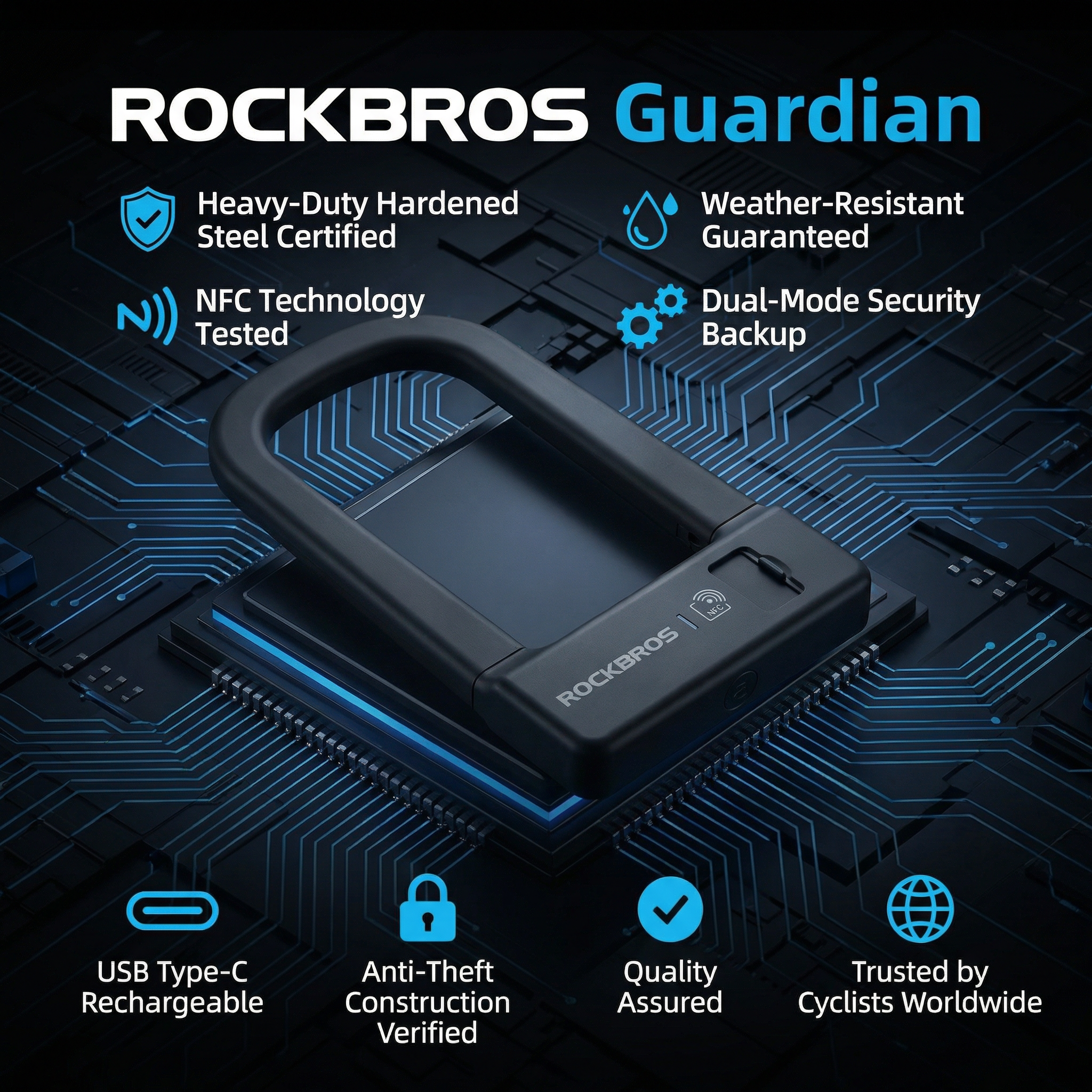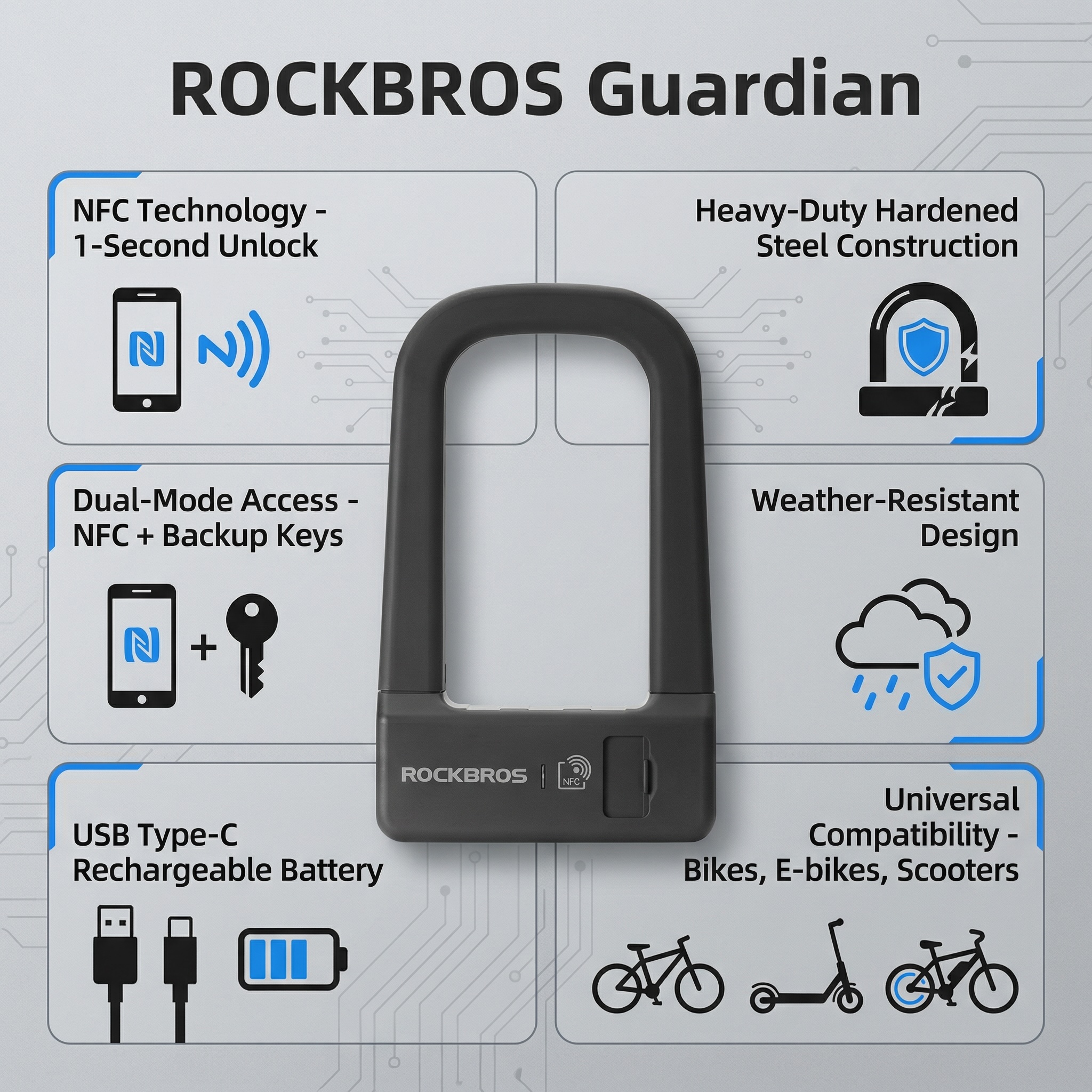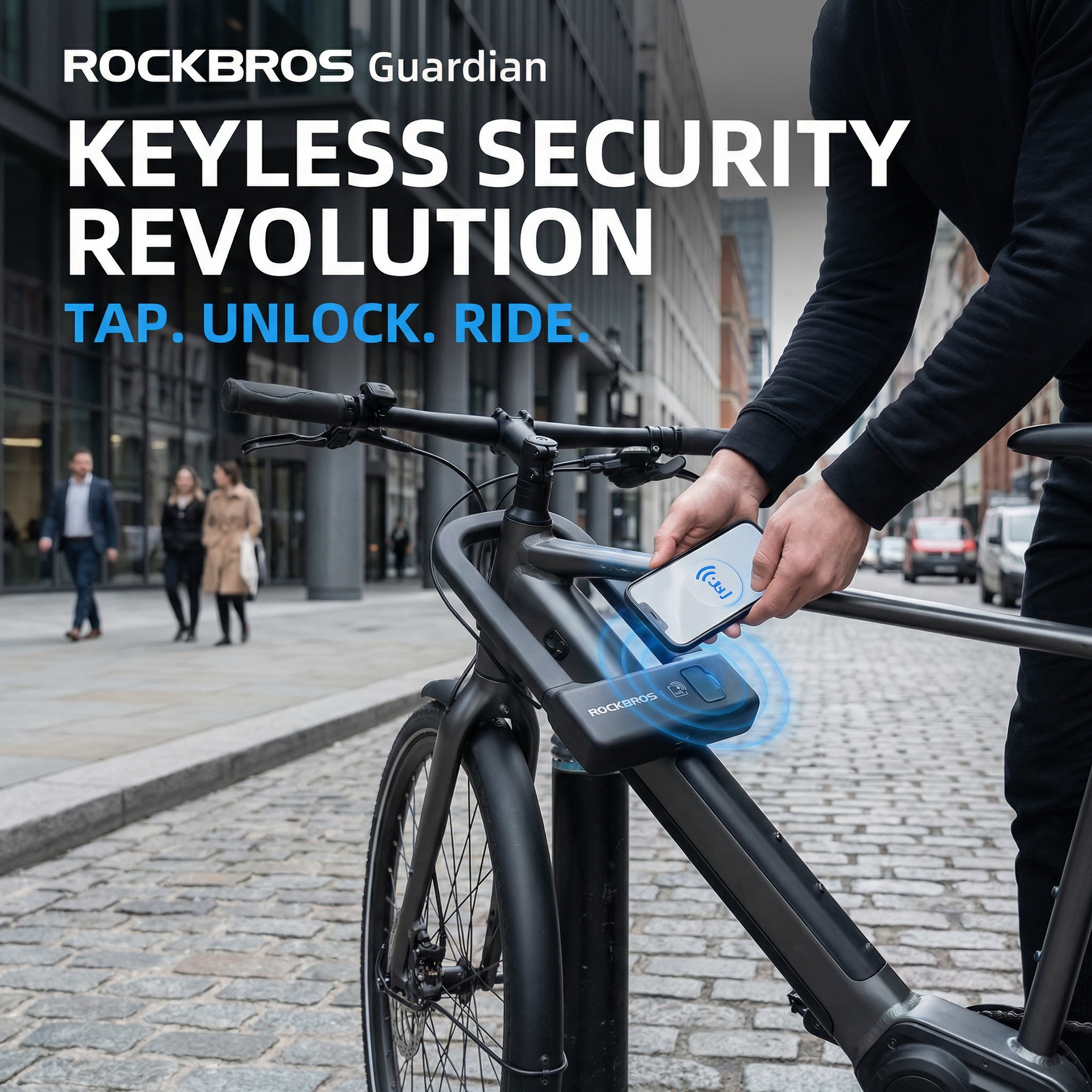 Secure your ride instantly with the ROCKBROS Guardian NFC Smart U-Lock. Forget fumbling for keys—unlock your bike, e-bike, or scooter in under a second with a simple tap! It combines heavy-duty steel protection with modern tech.