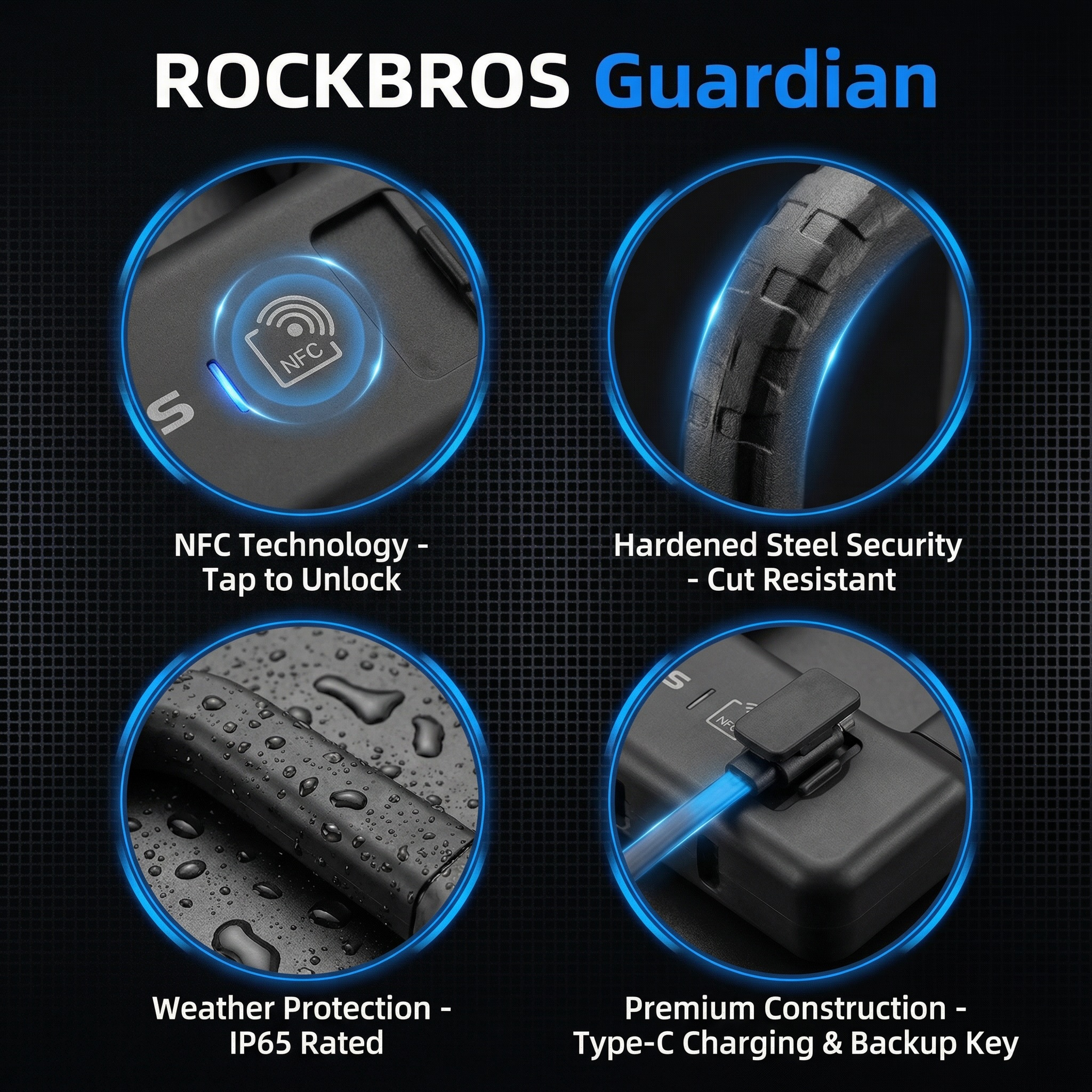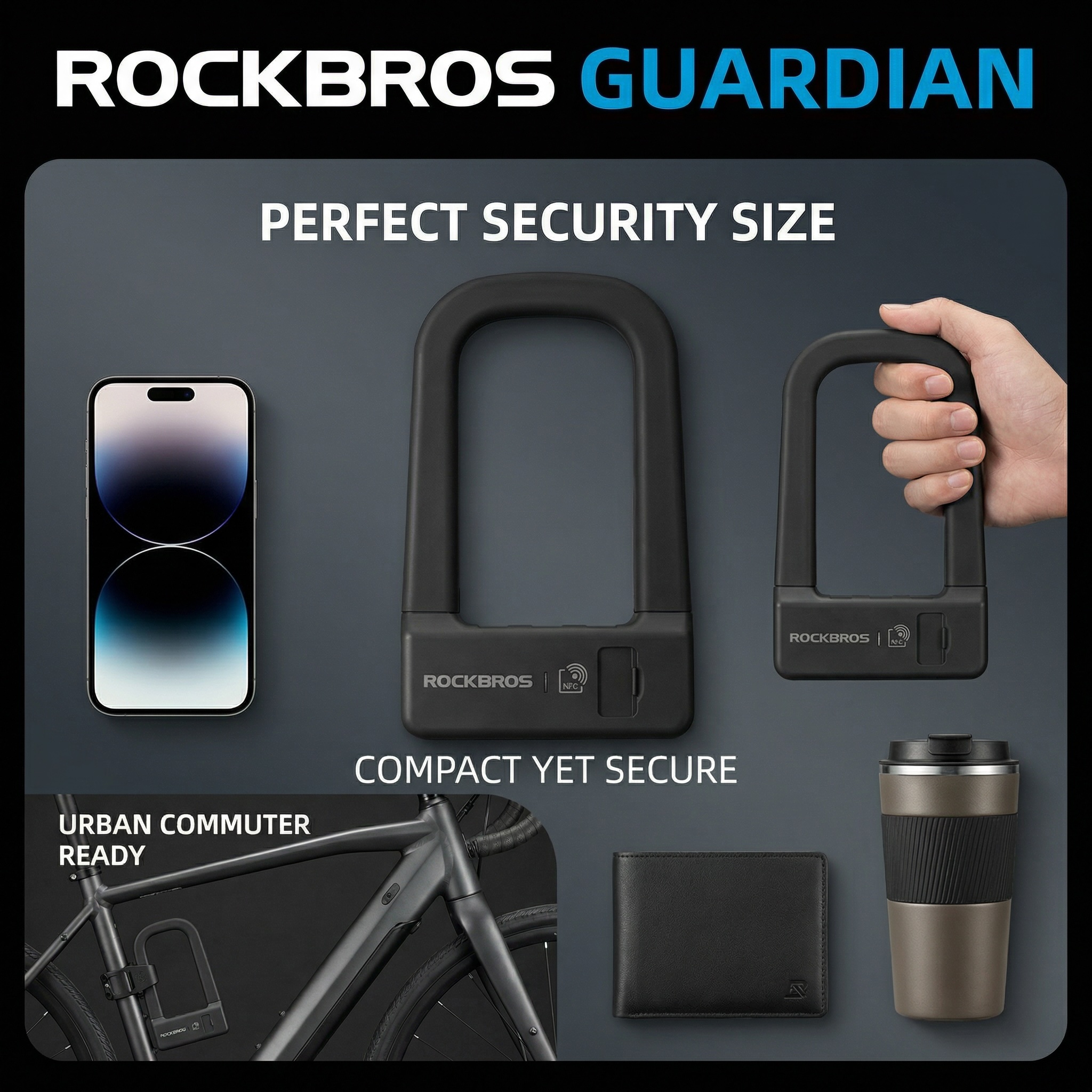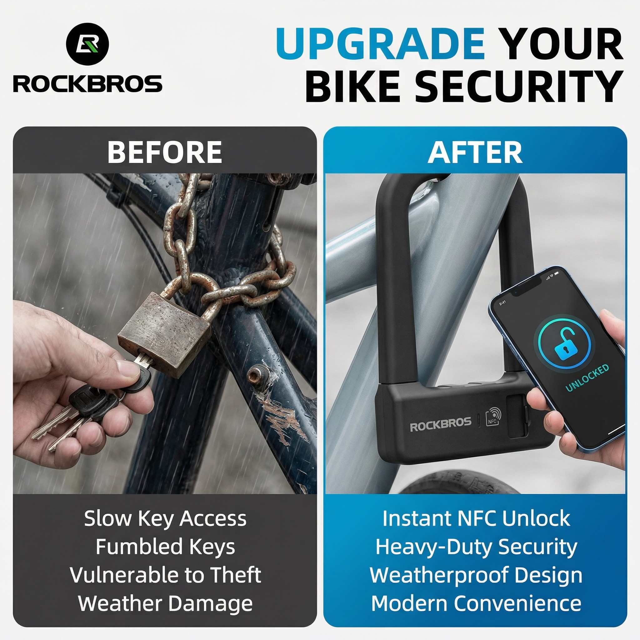 Secure your ride instantly with the ROCKBROS Guardian NFC Smart U-Lock. Forget fumbling for keys—unlock your bike, e-bike, or scooter in under a second with a simple tap! It combines heavy-duty steel protection with modern tech.