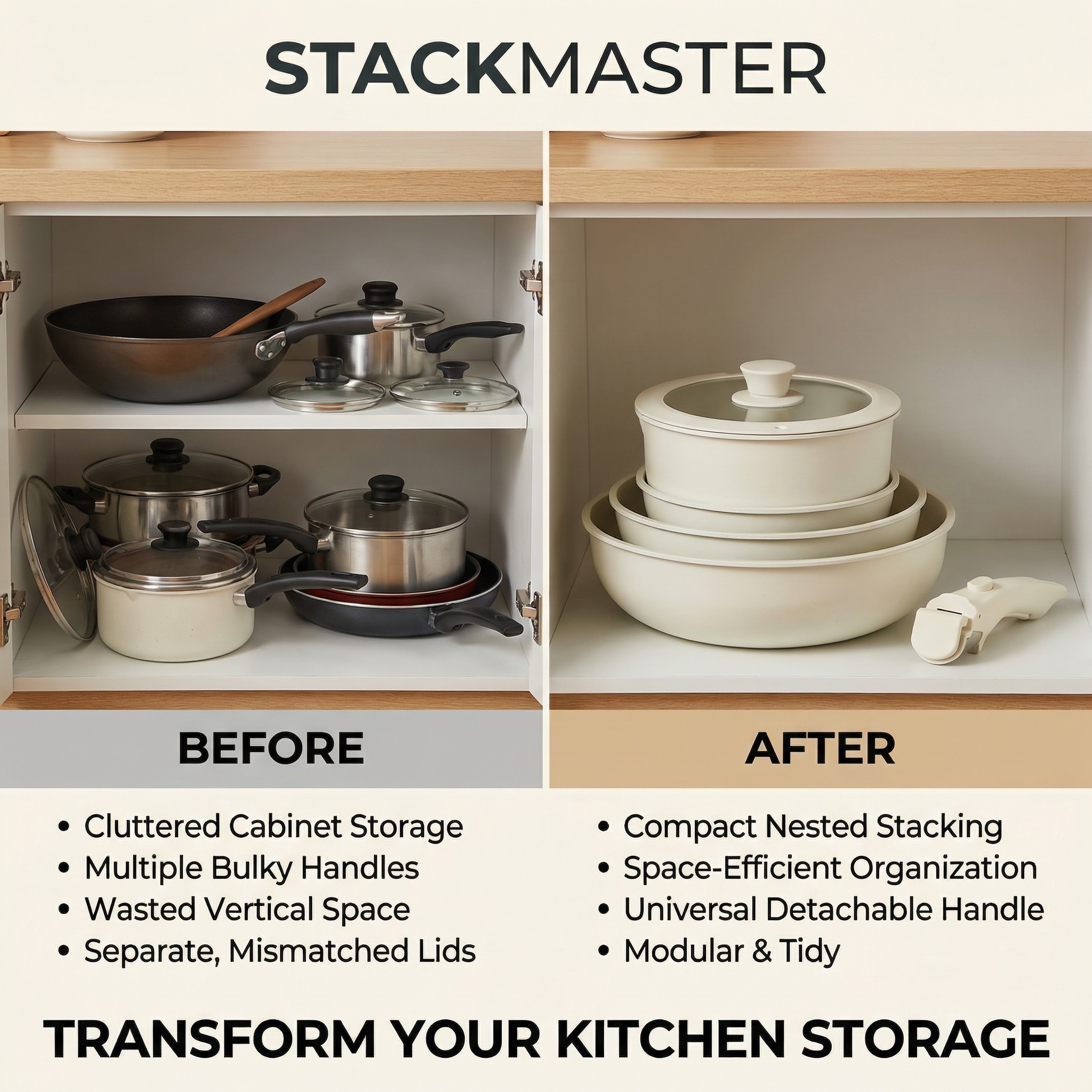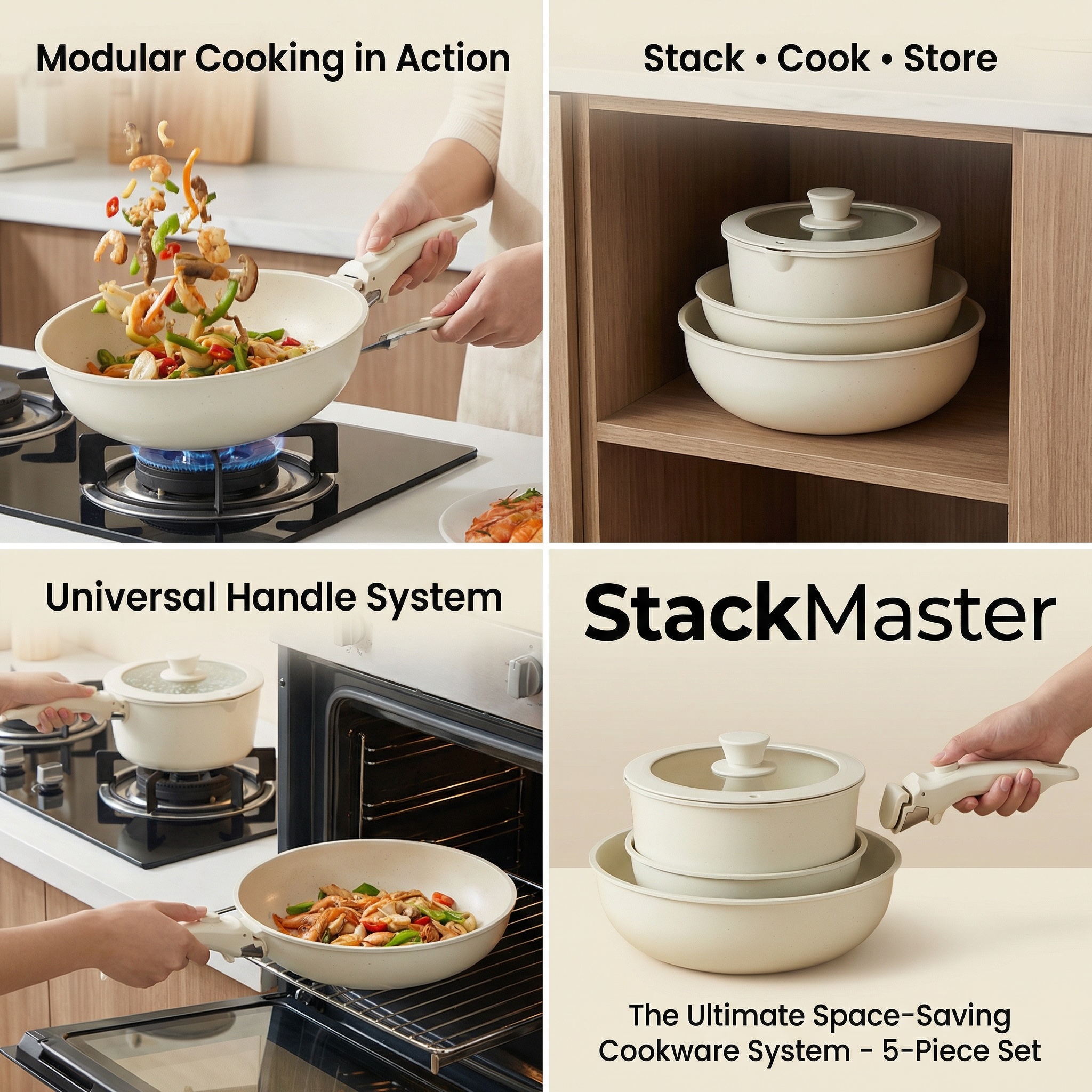 Maximize kitchen space with the StackMaster 5-Piece Non-Stick Set. Featuring a secure detachable handle, these pans stack perfectly to reclaim cabinet room. Transition from stovetop to oven (handle-off) to table effortlessly. Ideal for RVs & apartments.
