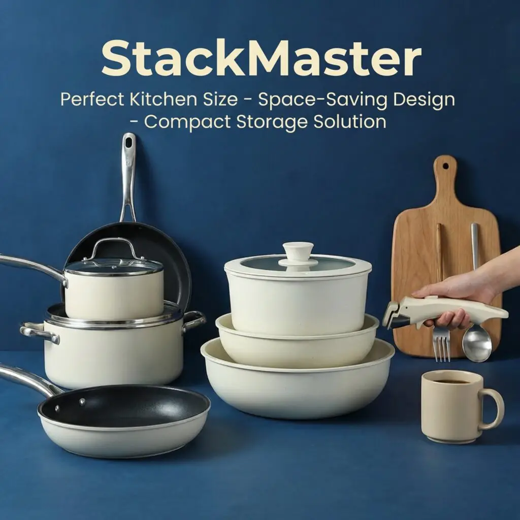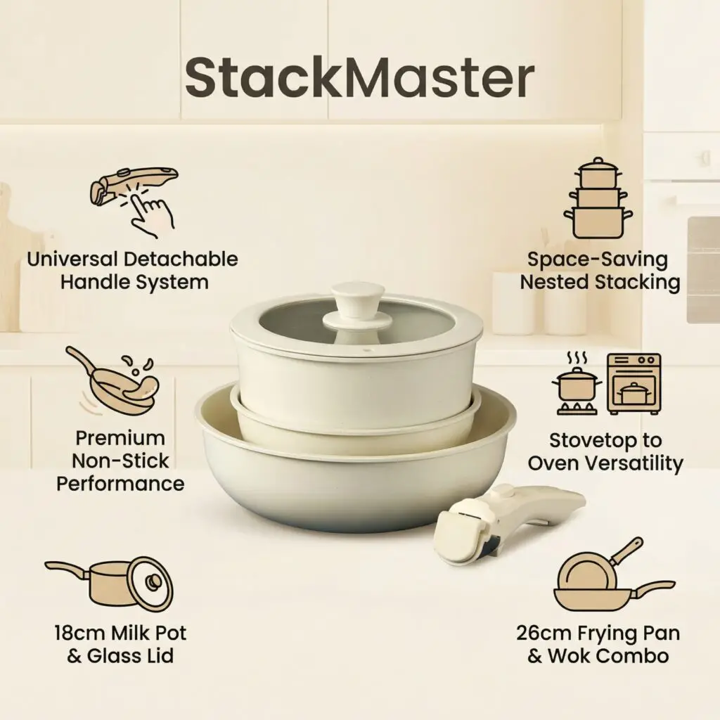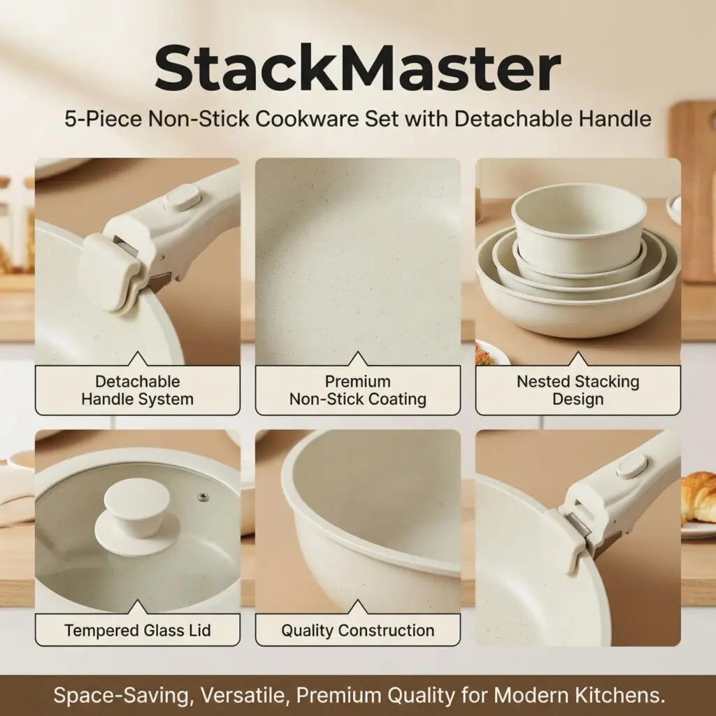 Maximize kitchen space with the StackMaster 5-Piece Non-Stick Set. Featuring a secure detachable handle, these pans stack perfectly to reclaim cabinet room. Transition from stovetop to oven (handle-off) to table effortlessly. Ideal for RVs & apartments.