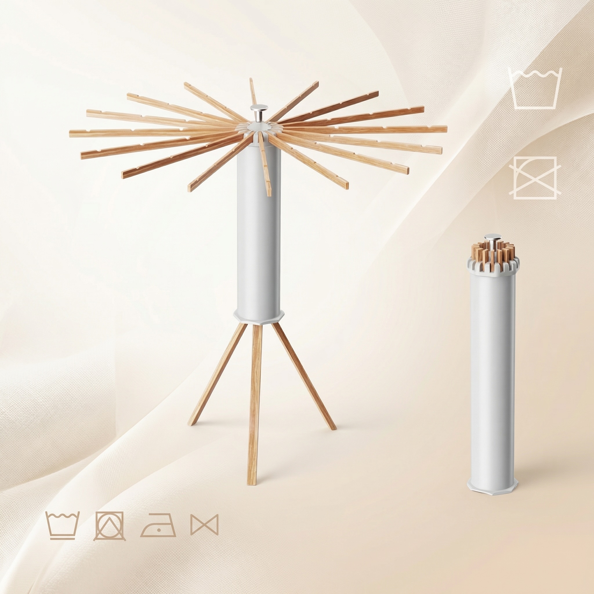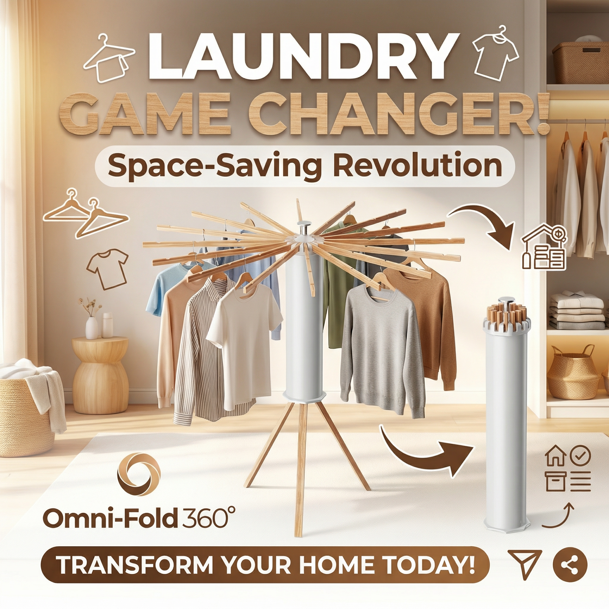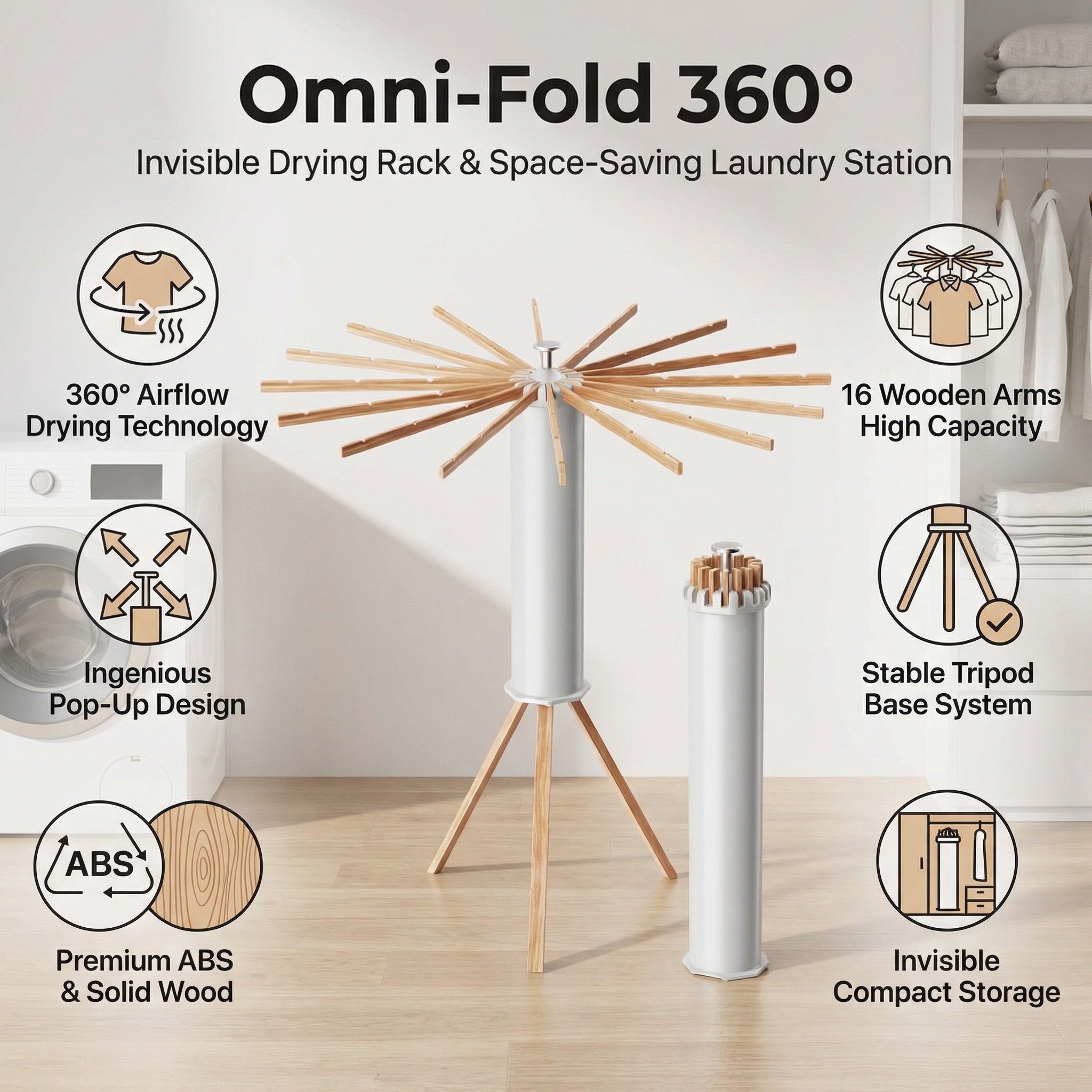 Revolutionize laundry day with the Omni-Fold 360° Invisible Drying Rack. This sleek unit hides as a compact cylinder but expands into a massive drying station. Perfect for apartments!