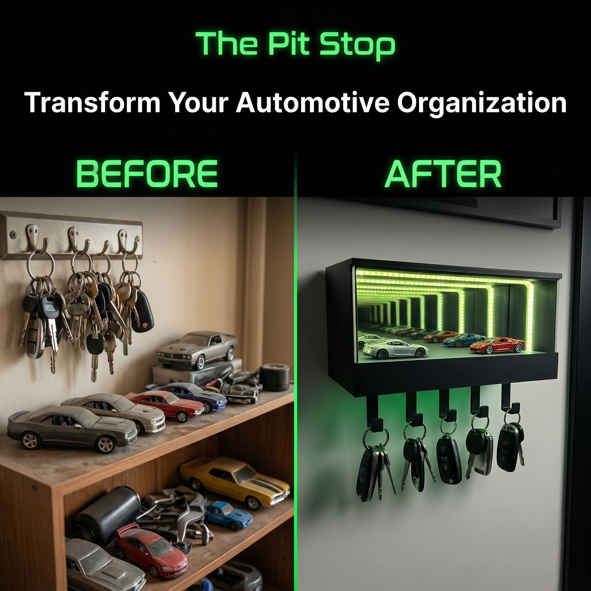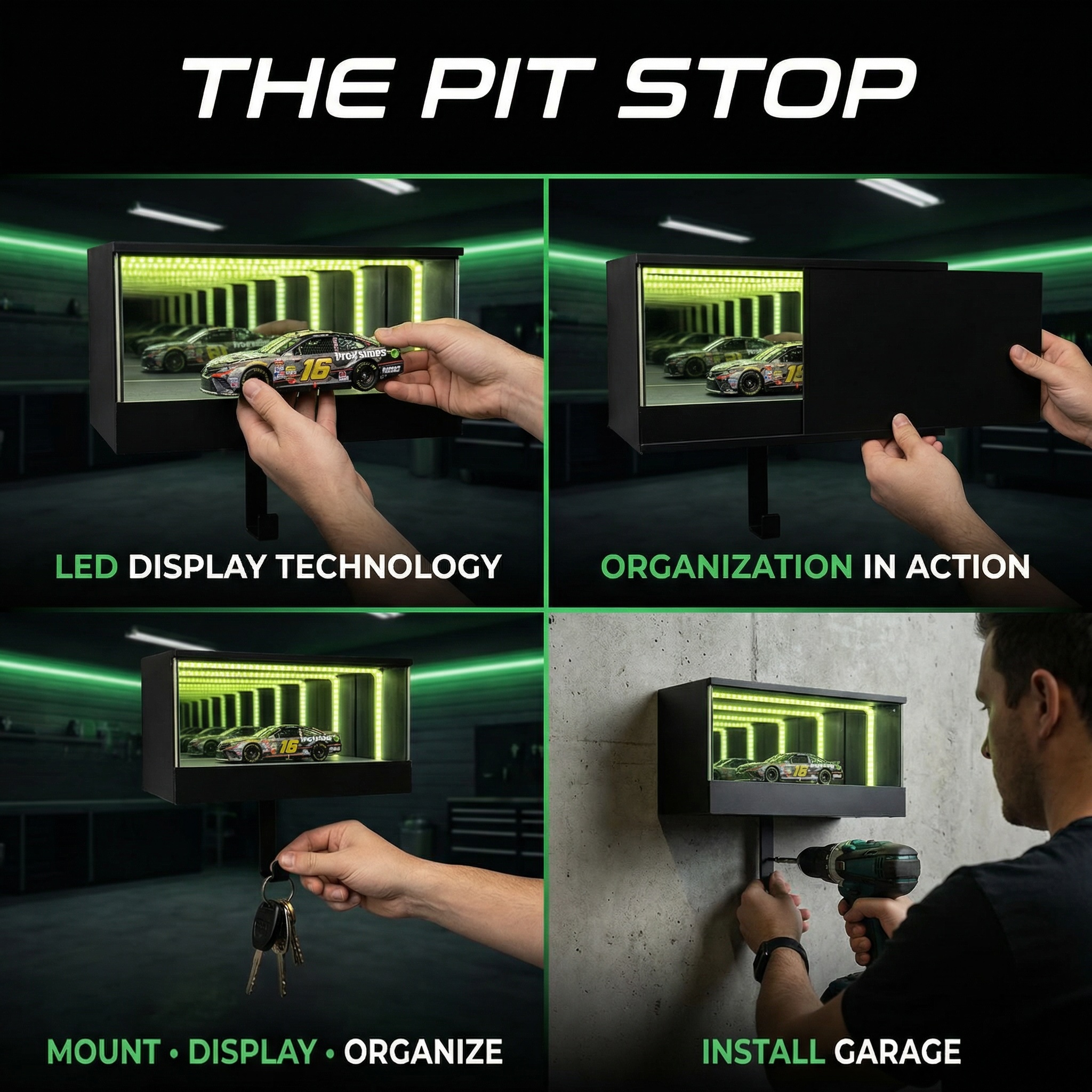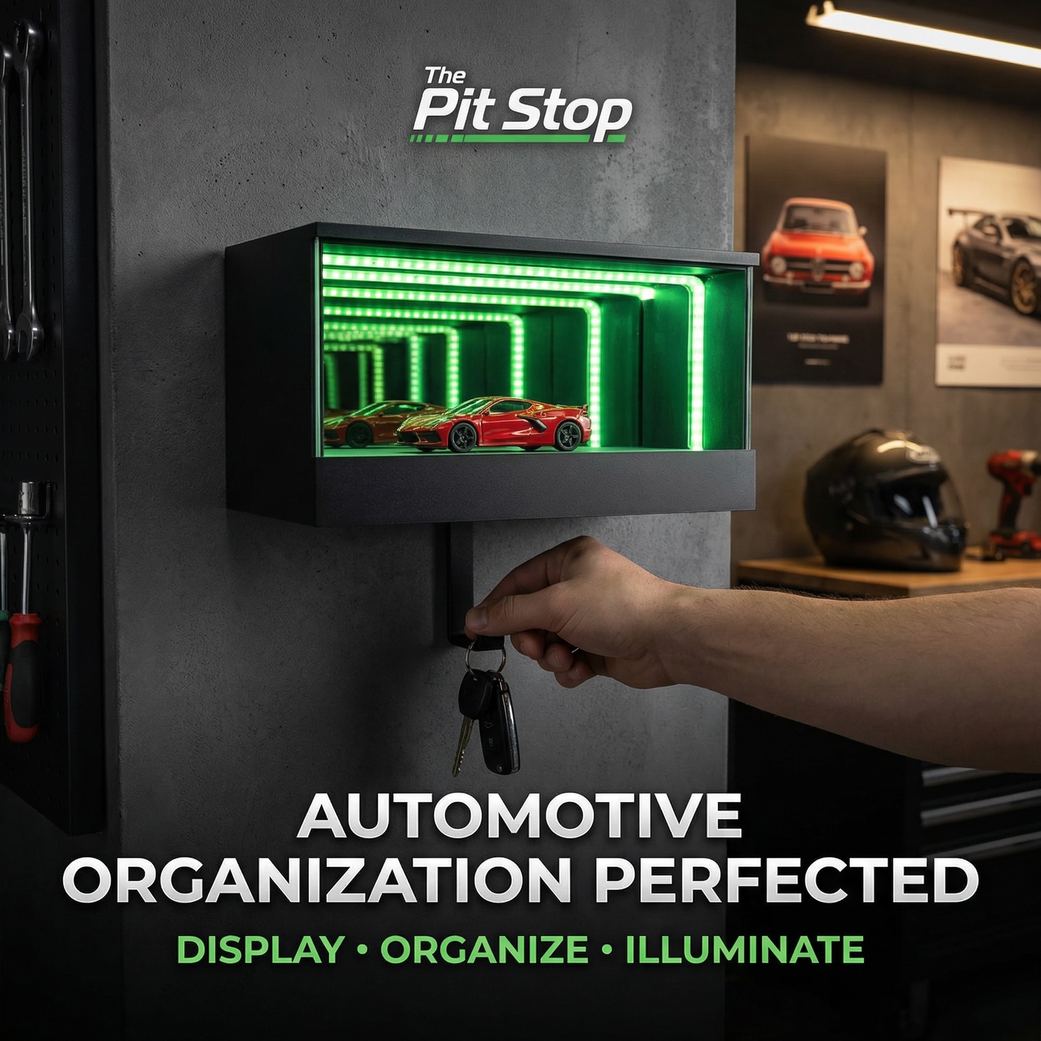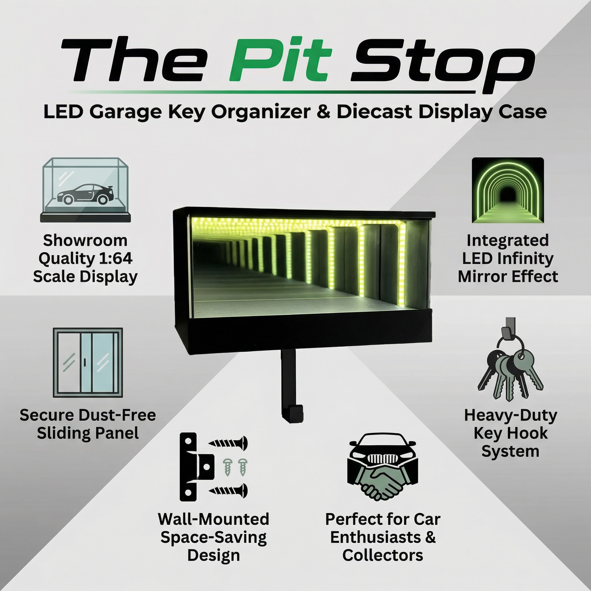 Park your keys in style with The Pit Stop: LED Garage Key Organizer. Transform your entryway into a lighted showroom for your favorite 1:64 diecast car. It’s the ultimate man cave accessory!