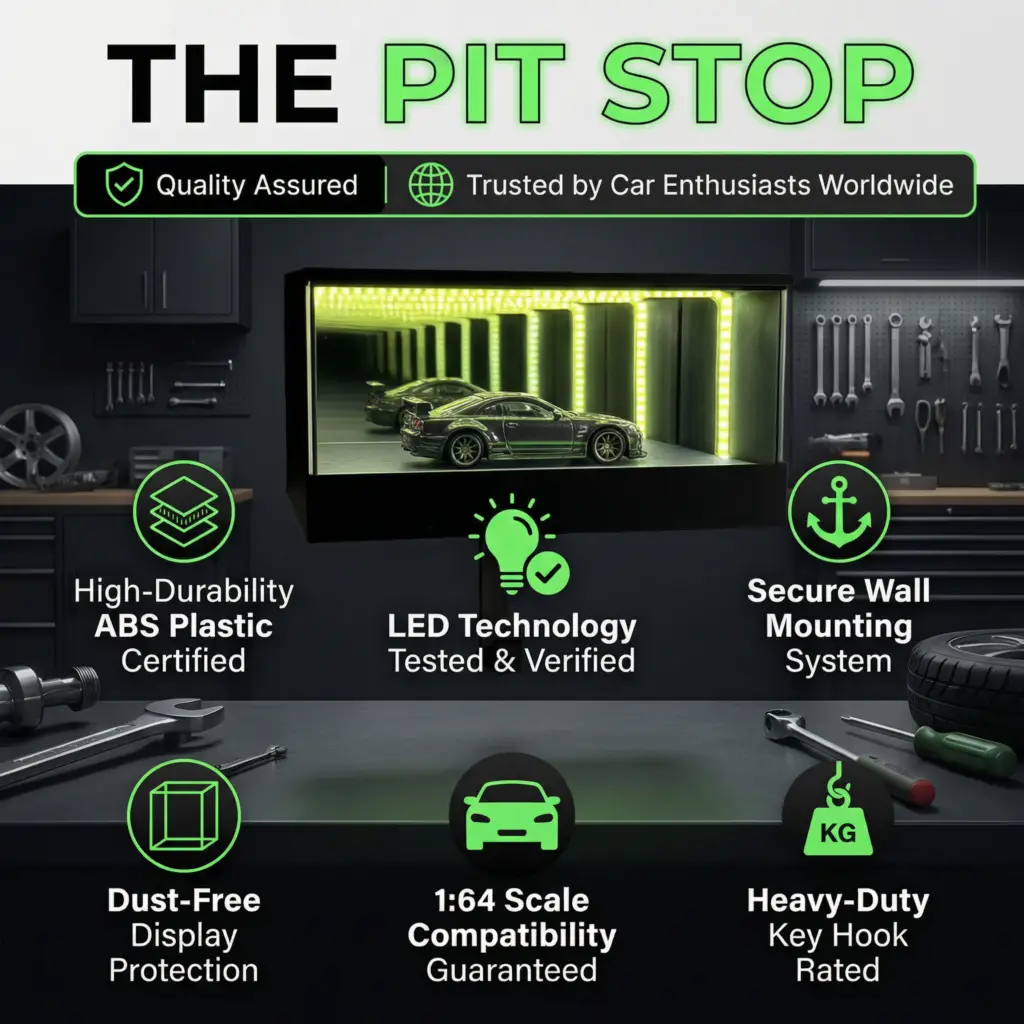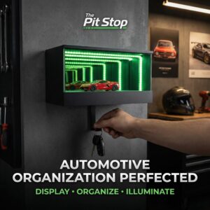 Park your keys in style with The Pit Stop: LED Garage Key Organizer. Transform your entryway into a lighted showroom for your favorite 1:64 diecast car. It’s the ultimate man cave accessory!