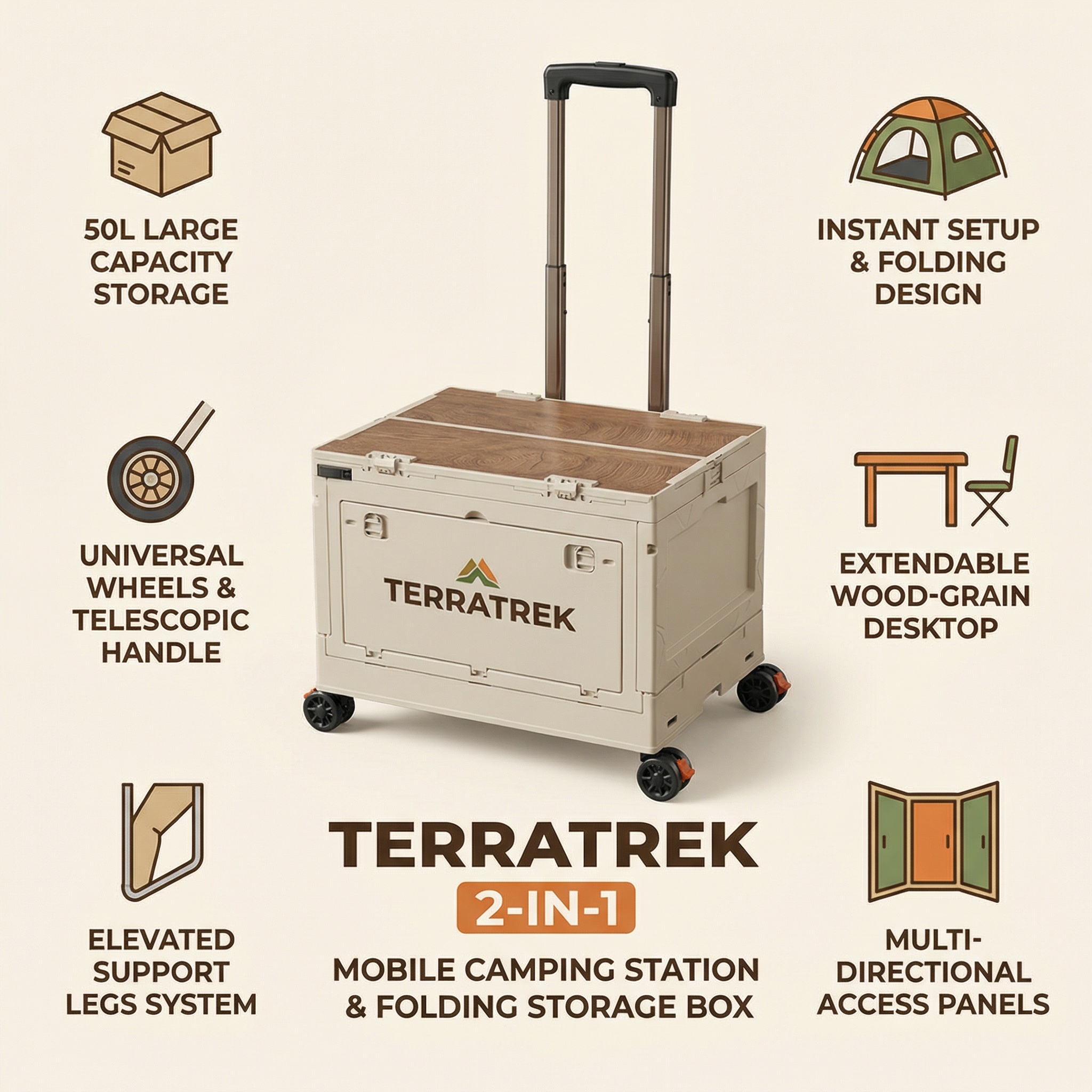 Elevate your outdoors with the TerraTrek 2-in-1 Mobile Camping Station. This rolling storage box transforms into a stylish picnic table in seconds. Ideal for camping & tailgating!
